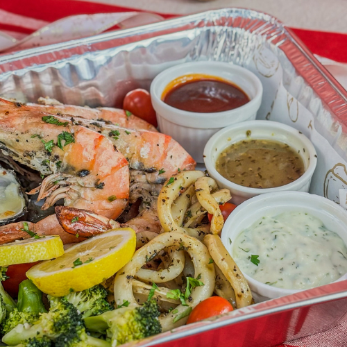 The platter is accompanied by two delectable sauces a rich, aromatic garlic sauce for savoury depth, and a zesty lemon herb sauce that adds a bright, citrusy lift. Perfect for sharing or indulging in a hearty, flavour-packed seafood experience. Serves (5-6 pax)