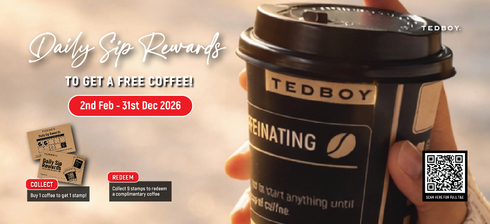 Good news for coffee lovers Tedboy Daily Sip Rewards makes your daily coffee even more rewarding. Every cup brings you one step closer to a FREE coffee.