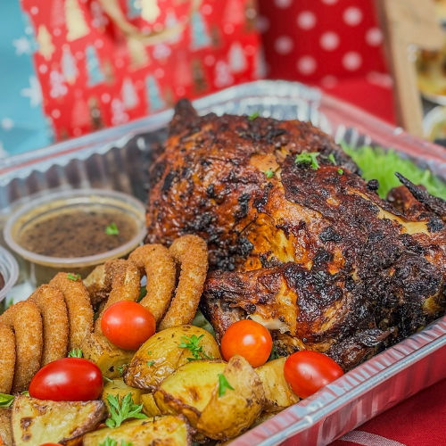 Our whole roasted chicken is cooked to juicy, golden perfection, offering tender meat and rich, savoury flavour in every serving. It comes accompanied by roasted carrots, crispy fried onion rings, and a duo of sauces a smoky BBQ sauceand a sweet, festive cranberry sauce.